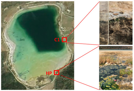 Satellite image of the Bagno dell’Acqua Lake (Pantelleria Island, Italy) reporting the location of the thermal spring (HP) where the samples for abiotic polymerization were incubated and the site (C1) of the microbialite sampling location. The total area of the lake is ~0.2 km2. Satellite image taken from https://earthexplorer.usgs.gov/ (accessed on 11 March 2025). Coordinates: HP: 36°81′39″ N, 11°98′82″ E. C1: 36°81′57.3″ N, 11°98′90″ E.