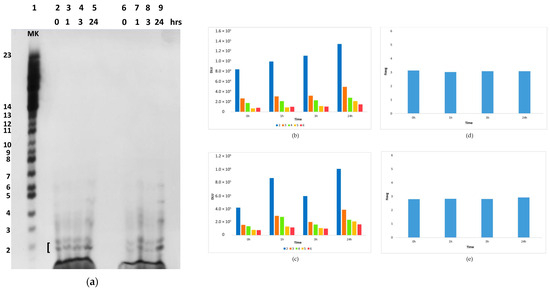 cGMP polymerization in situ in the Bagno dell’Acqua hot spring in the lake water. Panel (a): Lanes 1–4: first series of samples. Lanes 5–8: second series of samples. Lane 9: marker 5′ 32P-ribo G23. The experiment was conducted in duplicate to prove its reproducibility. Each sample was prepared by lyophilizing 150 μL of 1 mM 3′,5′ cGMP, suspended in situ in 150 μL of lake water and subsequently incubated at 50 °C in the thermal spring illustrated in Figure 1 HP for the indicated time. Each sample was treated and labeled independently. For the shortest oligomers, two or three different hydrolysis products (respectively, 2′,3′ P-bridged, open form, and loss of the 3′ phosphate) are observed (indicated by brackets). Panels (b,c): variation of the signal intensity in digital light units (hereafter DLU) as a function of time for the samples shown in panel (a) lanes 1–4 and 5–8, respectively. Length distribution of the polymerization products (length in nucleotide units; color coding is shown at the bottom of the panel) is indicated for each time point. Panels (d,e): the average length (Navg, in nucleotide units) of the polymerization products as a function of time for the samples shown in panel (a) lanes 1–4 and 5–8, respectively. Constant production of dimers and trimers in decisively high amounts keeps this value low.