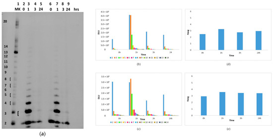 This aspect was further investigated by incubating another series of samples in the hot spring, in which cGMP was dissolved in Tris [Tris(hydroxymethyl)amino methane]-HCl buffered water at pH 9. As shown in Figure 4, the formation of oligomers with a maximum length of 13 units occurs after a period of one hour of incubation (although in smaller quantities than the oligomers formed in the lake water, as can be seen by comparing panels (b) and (c) in Figure 2 with panels (b) and (c) in Figure 4). However, in the absence of minerals, the newly formed RNA is rapidly degraded after three hours. A very marginal increase in dimers and trimers is again observed after 24 h.