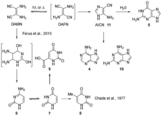 Synthetic pathway for the formation of nucleobases and their analogues [57,58].