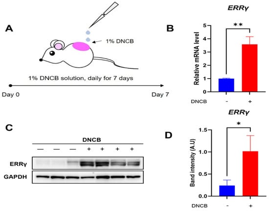 Expression of ERRγ in DNCB-induced AD lesions. (A) Schematic for induction of DNCB-induced AD. Expression levels of (B) ERRγ mRNA and (C,D) ERRγ protein in skin treated with either vehicle or DNCB. Either vehicle or 1% DNCB solution are topically treated on dorsal lesions of mice daily for seven days, followed by removal of inflamed lesions. ERRγ protein levels were normalized to GAPDH as a loading control. Data are presented as the mean ± SD; *, p < 0.05, **, p < 0.01, compared with the control.