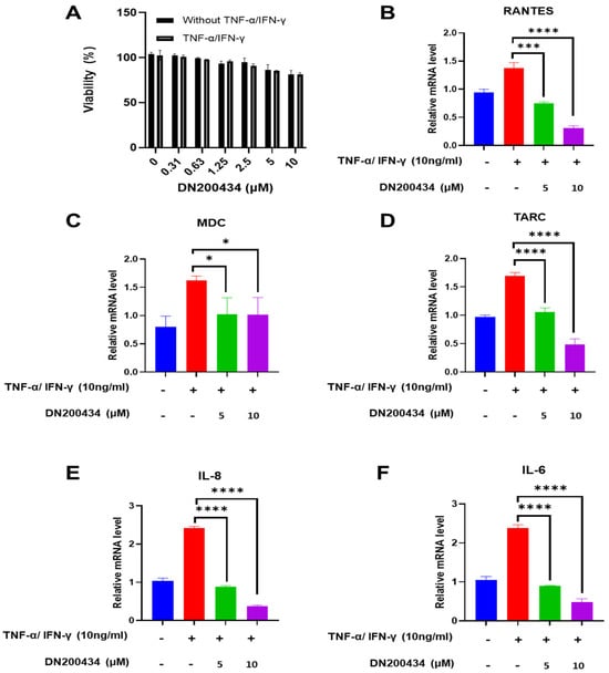 Regulation of chemokine and cytokine mRNA expression by DN200434 in TNF-α/IFN-γ-treated HaCaT cells. (A) Cell viability of HaCaT cells treated with or without TNF-α and IFN-γ at varying concentrations of DN200434. (B–F) DN200434-mediated down-regulation of chemokines and cytokines mRNA expression such as RANTES, MDC, TARC, IL-8, and IL-6 in TNF-α/IFN-γ-treated HaCaT cells. Data are presented as the mean ± SD; *, p < 0.05, ***, p < 0.0005, ****, p < 0.0001 compared with the control.