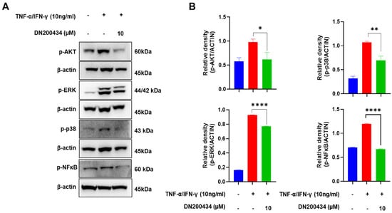 Inhibitory effect of DN200434 on AKT/MAPK/NF-κB signaling pathway in TNF-α/IFN-γ-treated HaCaT cells. (A) Western blot showing changes in the level of protein expression in TNF-α/IFN-γ-treated HaCaT cells by DN200434. (B) Graphs depicting results of quantitative analysis based on protein levels by a calibrated densitometer. Data are expressed in arbitrary units. *, p < 0.05, **, p < 0.01, ****, p < 0.0001 compared with the control.