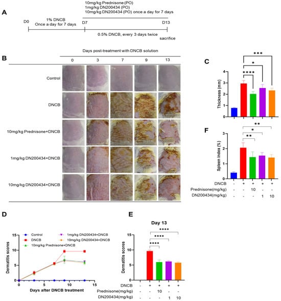 Effect of DN200434 on clinical symptoms of DNCB-induced AD. (A) Schematic for evaluation of anti-AD effects of DN200434 in DNCB-induced AD mice. (B) Representative image of mice with DNCB-induced AD. (C) Measurement of dorsal thickness on Day 13. (D) Dermatitis scores during in vivo experiments. (E) Bar graph showing the dermatitis score at day 13 after DNCB exposure. (F) Bar graph showing the spleen index day 13 after DNCB exposure. Data are presented as the mean ± SD; *, p < 0.05, **, p < 0.01, ***, p < 0.005, ****, p < 0.0001 compared with the control.