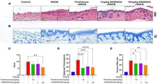 Histopathological findings in DNCB-induced AD lesions following DN200434 treatment. (A,B) Histologic findings in skin tissue section stained by H&E and toluidine blue staining (upper and lower panels, bar: 100 µm). (C) Histological scores. (D) Measurement of epidermal thickness using Image J (Version 1.54p, National Institutes of Health, Bethesda, MD, USA; available at: https://imagej.nih.gov/ij/, accessed on 17 February 2025). (E) A bar graph showing the mast cell numbers in Figure 6B. Data are presented as the mean ± SD; *, p < 0.05, **, p < 0.01, ***, p < 0.005, ****, p < 0.0001 compared with the control.