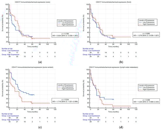 The Kaplan–Meier univariate analysis showed a statistically significant correlation between CDH17 immunohistochemical expression and OS in tumor emboli (p = 0.034), high CDH17 levels signifying a poor prognosis. The Kaplan–Meier univariate survival analysis indicated that the CDH17 immunohistochemical expression in the tumor core, the tumor invasive front, and lymph node metastasis had no effect on OS (Figure 2). Moreover, the univariable Cox proportional hazard analysis showed a significant correlation between CDH17 immunohistochemical expression and OS in N status (p = 0.007), LVI (p = 0.026), EMVI (p = 0.014), EPNI (p = 0.012), tumor emboli (p = 0.042), and prognostic stage group (p = 0.007) (Table 3).