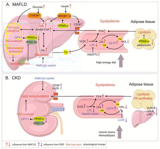 Mechanisms of lipid metabolism abnormalities in MAFLD and CKD. (A) In MAFLD, DNL enhanced by elevated insulin and glucose levels, FAO overload, and increased FA influx leads to lipid accumulation and steatosis. Excessive energy contributes to TCA mitochondrial dysfunction and ROS production. In turn, oxidative stress inhibits the PGC-1α/CPT-1/FAO axis. PPAR-γ shows opposite expression patterns in the liver and adipose tissue, enhancing hepatic DNL and adipocyte lipolysis, respectively, and exacerbating fat accumulation in MALFD. Increased levels of TG-containing VLDL are released into circulation, together with decreased HDL-c and increased LDL-c levels, which are regulated by increased CETP and inhibited LPL, forming dyslipidemia. (B) In CKD, abnormality of enzymes including LPL, LCAT, and CETP and dysregulated expression of VLDLR, LDLR, and LRP contribute to CKD dyslipidemia, characterized by increased LDL-c levels, elevated VLDL levels, and impaired HDL. Abnormal lipid enzymes in CKD are also related to uremic toxins and dialysis status. Down-regulation of the PGC-1α/CPT-1 pathway in the renal tubules and up-regulation of transporters such as CD36 cause lipid accumulation in the kidneys.