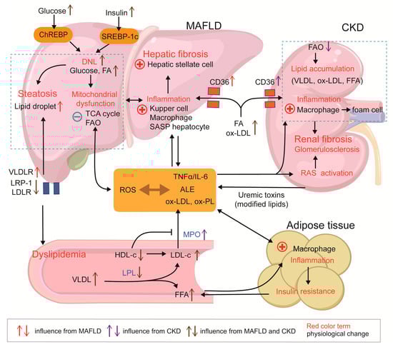 Metabolic dysfunction linking MAFLD and CKD. (MAFLD) and chronic kidney disease (CKD) share a dyslipidemic signature, including decreased HDL-C, elevated LDL-C and VLDL, and altered lipoprotein receptor profiles. Hepatic lipid overload precipitates mitochondrial dysfunction and ROS generation, whereas impaired toxin clearance in renal failure magnifies this oxidative milieu. ROS drive the formation of ALE, ox-LDL, ox-PL, and other pro-inflammatory danger-associated molecular patterns, fostering systemic multi-organ inflammation. Adipose inflammation aggravates insulin resistance and liberates FFAs, accelerating lipid flux to both the liver and kidney, which is ectopic fat accumulation. In the liver, ALEs and CD36-mediated ox-LDL uptake activate resident immune cells and trigger HSC-driven fibrosis. In the kidney, deposition of ox-LDL, FFAs, and other lipoproteins induces macrophage foam-cell formation and promotes glomerulosclerosis and fibrosis.