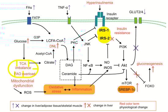 Cellular mechanism of hepatic and peripheral insulin resistance. Under obesity and systemic inflammation, FA input and cytokine stimulation is increased. FAO/TCA imbalance and mitochondrial dysfunction causes an increase in ROS and lipotoxic products (DAGs and ceramides) of DNL. The inflammatory factor TNF-α activates the NF-κβ/JNK and iNOS-NO pathways, impairing the IRS/Akt/GLUT2/4 insulin signaling pathway; DAG/PKC signals inhibit the insulin receptor, and ceramide induces the iNOS inflammatory pathway and inhibits Akt. Hepatic insulin resistance is selective: Inactivation of the IRS2/AKT/FOXO signaling pathway leads to a decrease in insulin’s ability to inhibit glucose metabolism; due to differences in the intrahepatic expression distribution of IRS-1 and IRS-2, the IRS-1/Akt/mTOR pathway is less affected by PKC signaling, thereby enhancing SREBP-1c/DNL.