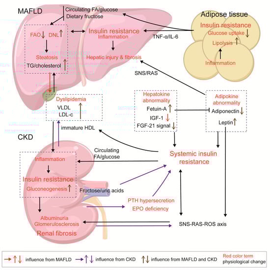 Our review highlights that metabolic dysfunction-associated fatty liver disease (MAFLD) is a potent initiator and accelerator of chronic kidney disease (CKD), whereas CKD can reciprocally worsen hepatic steatosis. On the one hand, excessive ectopic lipid accumulation and insulin resistance unify MAFLD and CKD pathogenesis, promoting their oxidative stress, inflammation, and fibrosis through shared pathways, such as dyslipidemia induced by the impairment of related enzymes and receptors, activation of inflammatory signals mediated by cell senescence, ALEs, ox-LDL, CD36, and RAGE/TLR-4, and insulin signaling impairment driven by PPAR signals and LCFA/DAG/ceramide. Systemic involvement via the SNS/RAS/ROS axis, exacerbated by insulin resistance and altered adipokine/hepatokine profiles, intensifies mutual hepatic and renal injury. On the other hand, advanced CKD results in excessive lipotoxins, uremic toxins, and PTH, as well as deficiency in EPO, in a unique pattern that causes systemic inflammation and insulin resistance. Hepatic insulin resistance is selective, as evidenced by preserved gluconeogenesis and DNL effects but impaired glucose uptake and glycogen synthesis, whereas peripheral insulin resistance is biased toward enhanced lipolysis. The interaction between MAFLD and CKD reinforces the loop of “extrahepatic energy donation and hepatic storage”.