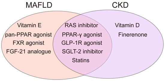 To date, only resmetirom has been approved by the FDA in 2024 as a standard treatment for MAFLD. As a selective thyroid receptor agonist, resmetirom is indicated for alleviating fibrosis non-cirrhotic MASH and reducing hepatic fat accumulation []. However, several medications for obesity, diabetes, and cardiovascular diseases are recommended in MAFLD guidelines. For CKD, in addition to RAS inhibitors (RASIs) and SGLT-2 inhibitors (SGLT-2I) as first-line drugs, treatment also involves multiple complications, such as drugs to correct anemia, calcium supplements, antiplatelet agents, other antihypertensive drugs, antidiabetic drugs, etc. []. With the goal of correcting metabolic disorders, there is potential for overlap in the use of medications for MAFLD and CKD. Metabolism-related medications for MAFLD and CKD are listed in Table 1 and Table 2. Among them, the shared drugs used by two diseases with proven clinical potential are shown in Figure 5.
