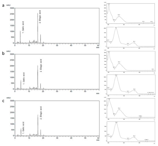 Chromatograms and UV spectra of gallic acid (1) and ellagic acid (2) detected in the R. rugosa Thunb. flower bud extract (a) 3, (b) 6, and (c) 9 days after flower bud blooming.