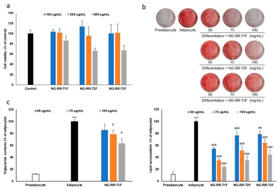 To evaluate how NG-RR-T1F affects TG accumulation during adipocyte differentiation, we treated 3T3-L1 cells with the extract throughout the entire cell differentiation period. NG-RR-T1F treatment significantly reduced intracellular TG levels without affecting cell viability, confirming its anti-adipogenic effect (Figure 2c).