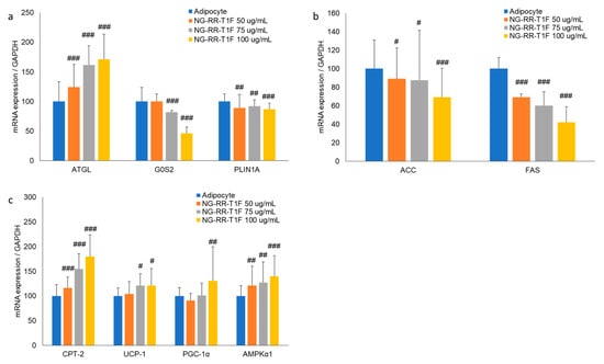 Effects of NG-RR-T1F on lipid metabolism-related mRNA expression in 3T3-L1 adipocytes. Cells were differentiated into adipocytes in the presence or absence of NG-RR-T1F. (a) NG-RR-T1F regulates lipolysis-related mRNA expression. (b) NG-RR-T1F regulates lipogenesis-related mRNA expression. (c) NG-RR-T1F enhances energy expenditure-related mRNA expression. # p < 0.05, ## p < 0.01, and ### p < 0.001 vs. the adipocyte group.