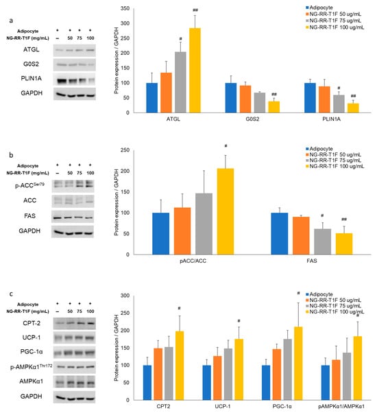 Effects of NG-RR-T1F on lipid metabolism-related protein expression in 3T3-L1 adipocytes. Cells were differentiated into adipocytes in the presence or absence of NG-RR-T1F. (a) NG-RR-T1F regulates lipolysis-related protein expression. (b) NG-RR-T1F regulates lipogenesis-related protein expression. (c) NG-RR-T1F enhances energy expenditure-related protein expression. # p < 0.05 and ## p < 0.01 vs. the adipocyte group.