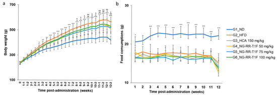 Significant differences emerged in body weight between the normal diet (ND) and HFD groups (G1 and G2, respectively) by week 3. NG-RR-T1F administration at doses of 50 mg/kg (G4) and 75 mg/kg (G5) resulted in significant body weight reduction beginning week 8 compared to the HFD group, and this effect persisted until the end of the study. Although a dose of 100 mg/kg (G6) also reduced body weight, the difference was not statistically significant. At the end of the study, the mean body weights in G2 and G4 were 564.31 and 509.43 g, representing a 9.72% reduction in the latter. G5 and G6 exhibited average mean weights of 517.49 and 527.29 g, corresponding to 8.30% and 6.56% reductions, respectively. We observed no significant differences in food intake among the groups, suggesting that the observed weight loss was not attributable to reduced appetite (Figure 5b).