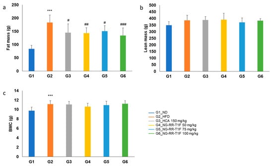 Effects of NG-RR-T1F on body compositions in HFD-induced obese rats. (a) Fat mass, (b) lean mass, and (c) bone mineral content. The values are expressed as the mean ± SD (n = 8). *** p < 0.001 vs. G1_ND; # p < 0.05 and ## p < 0.01, and ### p < 0.001 vs. G2_HFD.