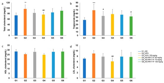 Effects of NG-RR-T1F on serum lipid parameter in HFD-induced obese rats. (a) Total cholesterol, (b) triglyceride, (c) HDL-C, and (d) LDL-C. The values are expressed as the mean ± SD (n = 8). ** p < 0.01 and *** p < 0.001 vs. G1_ND; # p < 0.05 and ## p < 0.01 vs. G2_HFD.