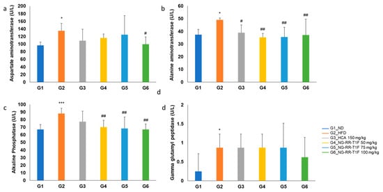 Effects of NG-RR-T1F on serum liver function parameters in HFD-induced obese rats. (a) AST, (b) ALT, (c) ALP, and (d) GGT. The values are expressed as the mean ± SD (n = 8). * p < 0.05 and *** p < 0.001 vs. G1_ND; # p < 0.05 and ## p < 0.01 vs. G2_HFD.