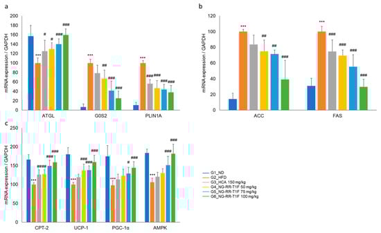 Effects of NG-RR-T1F on lipid metabolism-related mRNA expression in the epididymal fat tissue of HFD-induced obese rats. (a) NG-RR-T1F regulates lipolysis-related mRNA expression. (b) NG-RR-T1F regulates lipogenesis-related mRNA expression. (c) NG-RR-T1F enhances energy expenditure-related mRNA expression. The values are expressed as the mean ± SD (n = 8). *** p < 0.001 vs. G1_ND; # p < 0.05, ## p < 0.01 and ### p < 0.001 vs. G2_HFD.