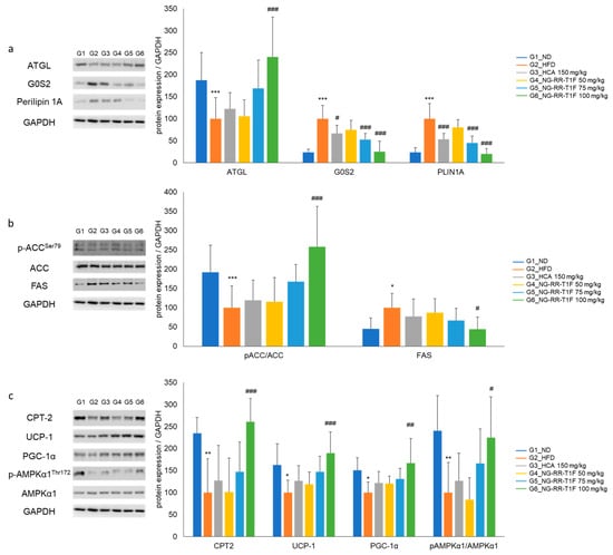 Effects of NG-RR-T1F on lipid metabolism-related protein expression in the epididymal fat tissue of HFD-induced obese rats. (a) NG-RR-T1F regulates lipolysis-related protein expression. (b) NG-RR-T1F regulates lipogenesis-related protein expression. (c) NG-RR-T1F enhances energy expenditure-related protein expression. The values are expressed as the mean ± SD (n = 8). * p < 0.05, ** p < 0.01, and *** p < 0.001 vs. G1_ND; # p < 0.05, ## p < 0.01, and ### p < 0.001 vs. G2_HFD.