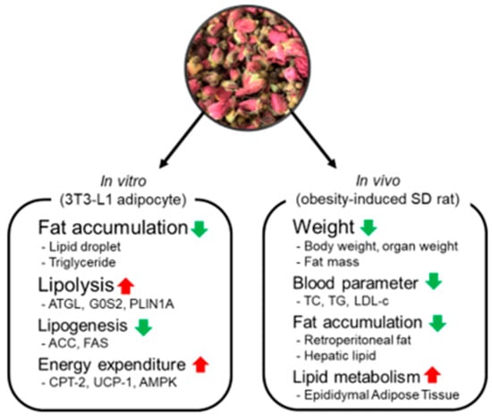 Taken together, our results demonstrate that NG-RR-T1F modulates lipid metabolism by lipolysis enhancement, lipogenesis inhibition, and mitochondrial energy expenditure promotion both in cellular and living animal models (Figure 13). If the safety and efficacy of NG-RR-T1F are confirmed in future clinical studies, this extract could serve as a promising candidate for functional food development aimed at obesity management. Furthermore, compared to other commercially available fat-reducing ingredients, NG-RR-T1F—derived from domestically sourced Rosa rugosa flower buds—offers advantages in terms of production scalability, cost efficiency, and ease of standardization, as it can be cultivated, extracted, and managed entirely within the Republic of Korea. These factors collectively support its potential competitiveness in the functional food market.