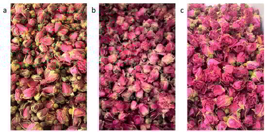 We procured R. rugosa Thunb. flower buds collected from Shandong Province, China, and categorized them based on their blooming stage, i.e., days 3, 6, and 9 (NG-RR-T1F, NG-RR-T2F, and NG-RR-T3F, respectively) (Figure 14). Each sample was extracted in duplicate from dried flower buds using 15 volumes (w/v) of distilled water at 100 °C for 4 h; then, we filtered the extracts through a 1 µm filter, concentrated them to 20° Brix, and subsequently freeze-dried them.