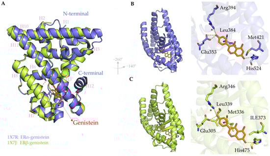 Genistein exhibits a binding orientation to ERs that closely resembles that of E2, particularly within the ERβ LBD [] (Figure 2A). Its phenolic ring mimics the A ring of E2, forming critical hydrogen bonds with Glu305 and Arg346, while the 7-OH group of genistein engages with His475, contributing to stable interactions within the binding cavity (Figure 2C). For the binding to ERα, the 4′-OH group of genistein forms hydrogen bonds with Leu339, Glu353, and Arg394, while the 7-OH group interacts with His524 (Figure 2B). Although the binding modes in ERα and ERβ appear nearly identical, subtle structural and electronic differences—such as the replacement of ERα Leu384 with ERβ Met336 and ERα Met421 with ERβ Ile373—modulate ligand selectivity. The smaller cavity size of ERβ, coupled with the planar structure of genistein, allows for tighter packing and more favorable van der Waals interactions [,]. Ab initio quantum chemical calculations further support that genistein preferentially interacts with bulkier Met336 in ERβ over Leu384 in ERα due to more favorable positioning and electronic compatibility []. While no significant repulsion was observed in the crystal structure between the 5-OH of genistein and the Met421 of ERα, the potential for differential interaction exists []. These findings suggest that modifying the genistein scaffold to exploit these residue-specific interactions could further enhance ERβ selectivity.