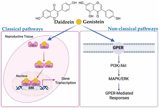 Classical and non-classical pathways of daidzein and genistein signaling. Created using BioRender by Aekkhaluck Intharuksa. Available at https://BioRender.com/3xgx6l4 (accessed on 29 June 2025).