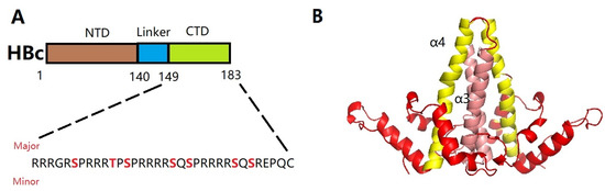 (A) Schematic diagram of HBc (genotype D), with each domain labeled at the top and amino acid positions labeled with numbers at the bottom. The CTD sequence is shown, with serine and threonine residues in the CTD that are targets for phosphorylation highlighted, including three major phosphorylation sites and four minor sites (bold red). (B) The HBc dimer (PDB:1QGT) is primarily composed of α-helices. The dimer interface is formed by a quadruple helix bundle composed of α1 (red), α2 (red), α3 (pink) and α4 (yellow) helices from each monomer.