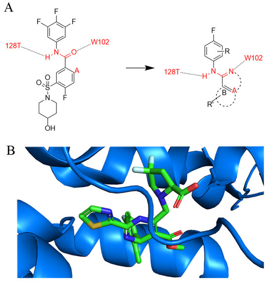 Based on this assumption, they envisioned that the primary consideration of hydrophobic elements could be achieved by substituting phenylurea. The methylene spacer in the core would allow exploration of the binding pocket and possibly the installation of a second urea nitrogen by reductive amination chemistry using a substituted aldehyde. And the bicyclic core also provides the suggested spatial site-blocking projections that occupy the three-dimensional space demonstrated in the structural biology results. This has led to the design of the clinical candidate AB-836, which is currently undergoing phase 1 clinical studies [45].