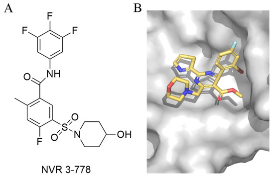 (A). NVR 3-778 (B). NVR 3-778 binds to chain B of HBV Cp (PDB code: 5E0I).
