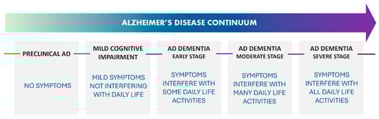 Several classifications of the advancement stages of the disease were proposed, leading to the definition of several AD stages. However, AD progression is not a discrete process and is referred to as a “continuum” []. The classification adopted by the 2024 Alzheimer’s disease facts and figures divides the AD continuum into three phases: (1) preclinical AD, (2) Mild Cognitive Impairment (MCI) phase, and (3) Alzheimer’s dementia. The AD dementia phase can also be sub-divided into mild, moderate, and severe dementia (Figure 1) [].
