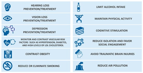The method of study privileged meta-analyses and research comparisons, conferring strong statistical evidence for the presented factors. The list suggests preventing and/or treating (i) hearing loss, (ii) vision loss, (iii) depression, and vascular risk factors such as (iv) hypertension (e.g., via blood pressure control), (v) diabetes, (vi) high levels of LDL cholesterol, and (vii) obesity. Additional suggestions regard lifestyle by showing benefits in (viii) reducing or eliminating smoking, (ix) limiting alcohol intake, and (x) investing in physical activity. Cognitive stimulation (xi) is regarded as a protective factor as well as a reduction in social isolation (xii). Finally, traumatic brain injuries (xiii) should be avoided, and air pollution minimized (xiv).