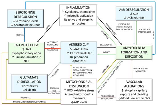 Among the neurotransmitter-based hypotheses, the serotonine-based one is interconnected with the amyloid beta and Tau pathologies, while ACh level depletion turns into Presenilin-1 (PS-1) mediated amyloid beta production. In addition, compromised ACh levels directly correlate with cognitive impairment. Glutamate dysregulation is strictly related to cellular toxicity and stress events, causing altered calcium signaling and mitochondrial dysfunction. Altered calcium signaling induces mitochondrial dysfunction and oxidative stress, acting also at the amyloid beta formation. Among the peptide-based hypotheses, the amyloid-based one is strictly interconnected with most of what has been previously mentioned, impairing neurotransmitters systems such as the ACh one (directly) and the glutamate one via altered calcium signaling. Tau pathologies are mainly involved in mitochondrial dysfunction. Aspecific events, such as neuroinflammation and vascular alterations, participate in both the two peptide-based hypotheses. As a result, as a preventive approach, inflammation control and putative vascular disease interventions could contribute to reducing amyloid beta formation. Care in serotoninergic-based prescriptions could be of help in preventing AD-associated pathologies. More details are described in the following sections.