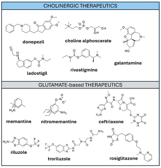 Chemical structure of cholinergic- and glutamate-based therapeutics exploited in AD [].