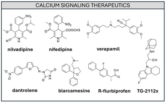Different strategies were applied to target the calcium signaling hypothesis, involving the regulation of cytosolic, ER, and mitochondrial Ca2+ levels []. Both the voltage-gated Ca2+channels (VGCCs) [] (allowing Ca2+ entrance upon neuronal depolarization) and receptor-operated Ca2+ channels (ROCs) (subsequently enabling calcium influx to the binding of a proper agonist) were targeted. A few examples of VGCC inhibitors are represented by nilvadipine, nifedipine, and verapamil (Figure 6) [].