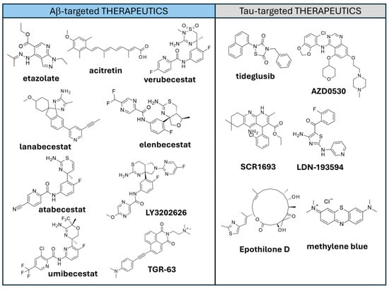 Amyloid-targeted treatments addressed both the modulation of APP cleavage by means of secretases [] and Aβ aggregation inhibition []. The three classes of secretases (α, β, γ) were targeted. α-secretases are involved in the non-amyloidogenic pathway of Aβ cleavage and activators were designed to favor this pathway. A few examples of α-secretase activators reaching clinical evaluation are Etazolate and Acitretin (Figure 7). Etazolate (EHT0202) exhibited safety and tolerability, but the pilot study did not highlight significant improvement in cognitive performance upon drug administration []. Acitretin was proven to elevate sAPP levels in CSF and lower the Aβ levels in early clinical studies []. β-secretases are involved in the cleavage of APP, leading to the formation of Aβ. Inhibition of β-secretases 1 (BACE1) is thus expected to decrease amyloid beta production (and deposition) []. BACE1 inhibitors such as Verubecestat, Lanabecestat, Elenbecestat, atabecestat, LY3202626, and Umibecestat (Figure 7) exhibited promising effects on preclinical and phase I–II clinical trials, but further clinical studies revealed a lack of efficacy and/or significant adverse effects [].