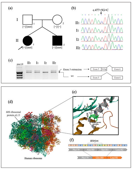 (a) Family pedigree analysis of P2. (b) Segregation analysis of c.477+5G>C variant detected in RPL13 by Sanger sequencing. (c) Splicing assay of the c.477+5G>C variant identified in P2, her affected twin brother, and her presumably unaffected father. Gel electrophoresis showing the presence of an abnormal longer fragment. Sanger sequencing of the aberrant amplified products revealed an extension of exon 5 by 54 nucleotides. (d) General organization of the human ribosome protein (6OLG); 60S ribosomal protein eL13 is indicated in bright green. (e) In window above is demonstrated p.Ala180_Ser181delinsGly variant localization; amino acids Ala180 and Ser181 are a part of alpha helix H7. (f) Deletion of the nonpolar neutral alanine and polar serine, along with the insertion of a single nonpolar glycine residue, results in the loss of a hydrophilic amino acid and may induce conformational changes in the protein’s secondary structure.