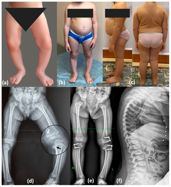 Phenotype and skeletal radiographies of P1 at various ages: Photos taken (a) at 1.5 years (before surgery); (b) at 3 years 7 months—after temporary hemiepiphysiodesis; (c) at 7 years 6 months—significant improvement was observed following plate removal and axial correction after 1.5 years. (d) Varus deformity of the lower limbs (3 y.o., before surgery)—severe on the left side and mild on the right side. Metaphyseal irregularities predominantly in the medial parts of the femur and tibia with mild “chondromatous” changes in the femur (white arrow) and Blount-like tibia vara (black arrow). (e) Correction of the deformities with the “guided growth” technique (3 years 7 months). Perthes-like fragmentation of the capital femoral epiphysis and widening of the femoral neck. (f) Irregularities of the vertebral endplates (white dotted lines) and enlarged distal parts of the ribs with rickets-like edges (white arrowheads).