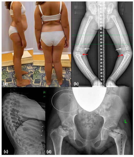 At the age of 9, her height was 133 cm (0.07 SD) and her weight was 43 kg (1.81 SD). Clinical examination revealed moderate genu valgum, more pronounced on the right, along with lateral instability in the right knee. Additionally, a waddling gait with widely spaced feet was observed. Other findings included internal rotation and varus deviation of the right foot, asymmetry of the scapulae and pelvis, lumbar hyperlordosis, restricted hip abduction, muscle hypotonia, and joint hypermobility (Figure 3).
