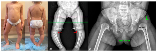 At the age of 7 years, her height was 115 cm (−1.31 SD) and her weight was 35 kg (1.99 SD). Detailed examination revealed a waddling gait, cervicothoracic kyphosis, lumbar hyperlordosis, a protruding abdomen, hand joint hypermobility, hyperextended knees, valgus deformity of the right lower limb, mild varus deformity of the left lower limb, and equino-abducto-plano-valgus foot deformity. Analysis of radiographic findings revealed age-related evolution of signs caused by abnormal ossification of the hip and knee joints, which contributed to similarities with a range of disorders included in the differential diagnosis, as detailed in Figure 2 and Supplementary Figure S1.