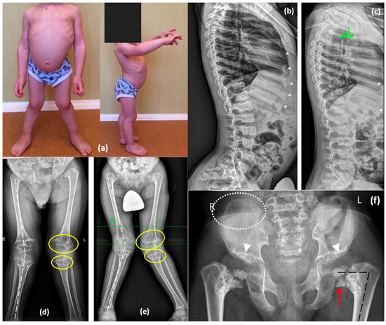 Phenotype and skeletal radiographies of P4 at various ages: (a) A photo taken at 3 years. Lateral radiographs of the spine at the age of 5 years (b) and 7 years (c)—double-convex contour of the endplates (white dotted lines) is moderately represented at the younger age and decreases later; enlarged distal parts of the ribs with rickets-like edges demonstrate the same pattern of improvement (white arrowheads). Lower limb radiographs at the age of 5 years (d) and 7 years (e) demonstrate progressive valgus deformities (white broken lines) secondary to the remarkable progression of the metaphyseal “chondromatous” changes (indicated by yellow lines). Pelvis radiographs at the age of 7 years (f) demonstrate coxa vara (black broken lines) secondary to the shortening and abnormal ossification of the femoral neck and head with Fairbank’s triangle (red arrow), dysplastic acetabulae (white arrowheads), and lace-like appearance of the iliac crests (rounded with the white dotted lines).