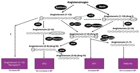 - Ferrario, C.M.; Iyer, S.R.; Burnett, J.C., Jr.; Ahmad, S.; Wright, K.N.; VonCannon, J.L.; Saha, A.; Groban, L. Angiotensin (1-12) in Humans With Normal Blood Pressure and Primary Hypertension. Hypertension 2021, 77, 882–890. [Google Scholar] [CrossRef] [PubMed]