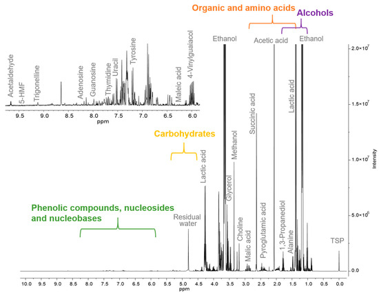 18]. However, it should be noted that LC-MS methods frequently necessitate meticulous sample preparation and chromatographic separation. Moreover, these methods may be susceptible to matrix effects. In contrast, nuclear magnetic resonance (NMR) spectroscopy has been shown to provide rapid, non-destructive, and quantitative metabolite profiling with minimal sample preparation and strong reproducibility. Despite its reduced sensitivity in comparison to LC-MS when it comes to low-abundance compounds, NMR facilitates absolute quantification and the concurrent detection of multiple compound classes. These include alcohols, sugars, nucleosides, organic acids, aldehydes, and amino acids, and this is possible in complex matrices such as beer [