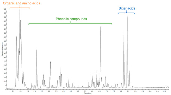 16]. In contrast, liquid chromatography–mass spectrometry (LC-MS) offers high sensitivity and extensive coverage of non-volatile and semi-volatile metabolites, encompassing organic acids, amino acids, and polyphenols derived from malt, hops, and fruit or herbal additions. Furthermore, it is frequently employed to identify hop-derived bitter acids (e.g., humulones and isohumulones) and their derivatives [