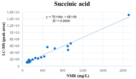 It is noteworthy that five compounds—succinic, citric, malic, tartaric, and gallic acids—were detected by using both NMR and LC-MS, thus enabling direct cross-platform comparison. This comparison was based on the quantitative NMR profiling results and relative intensity data from the LC-MS analysis. For instance, the application of linear regression analysis to the comparison of NMR and LC-MS measurements of succinic acid (