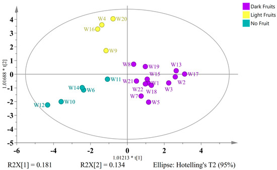 47]. As demonstrated in the relevant literature, blackcurrant leaves do contain valuable phenolics, such as quercetin and myricetin derivatives. However, they lack the high anthocyanin concentrations characteristic of the fruit, which have been shown to be potent contributors to antioxidant capacity. In the context of brewing, the efficiency of phenolic extraction is also a contributing factor. However, under the assumption of analogous extraction kinetics, the elevated intrinsic levels of anthocyanins and other polyphenols in dark fruits are likely to result in enhanced antioxidant activity in the final product. The majority of wild ales enriched with dark-colored fruits—including strawberries (W1), gooseberries (W2), raspberries (W3, W18, W21, W22), blackcurrants (W13, W17), cherries (W7, W17), red grapes (W3, W8, W21), blueberries, and plums (W5) have shown a consistent tendency to exhibit the highest antioxidant values. These findings are consistent with previous research that demonstrated higher antioxidant activity in fermented beverages made with berries or red grapes compared to those made with lighter fruits. Ljevar et al. found that blackberry, cherry, raspberry, and blackcurrant wines contained the highest total phenolic content and antioxidant capacity among 32 Croatian fruit wines, significantly exceeding the levels found in apple wines [