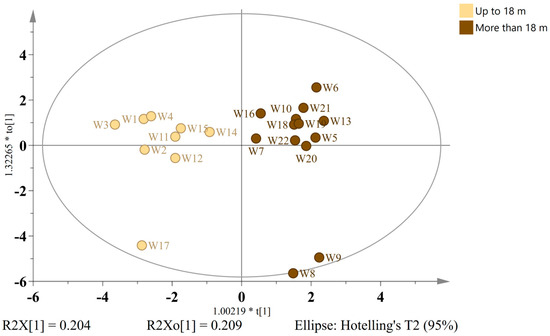 n = 3). A model based on OPLS-DA and 40 discriminatory variables (VIP > 0.9) exhibited adequate explanatory power (5 + 2 components; R