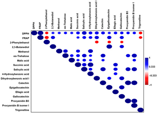 In order to elucidate the molecular contributors to the antioxidant activity in wild ales, Pearson correlation analysis was performed between antioxidant assays (DPPH and FRAP), and compounds were identified via NMR and LC-MS. A moderate positive correlation (r > 0.4) was observed for several metabolites, including 2,3-butanediol, succinic acid, malic acid, methanol, αα-trehalose, and key phenolic compounds such as 4-hydroxybenzoic acid, dihydroxybenzoic acid, catechin, ellagic acid, epigallocatechin, gallocatechin, and procyanidins (